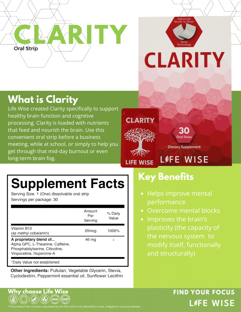 This nutrient dictionary provides a clear breakdown of the ingredients and their purposes in the CLARITY oral strip formula.
