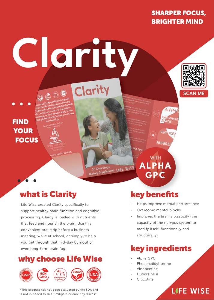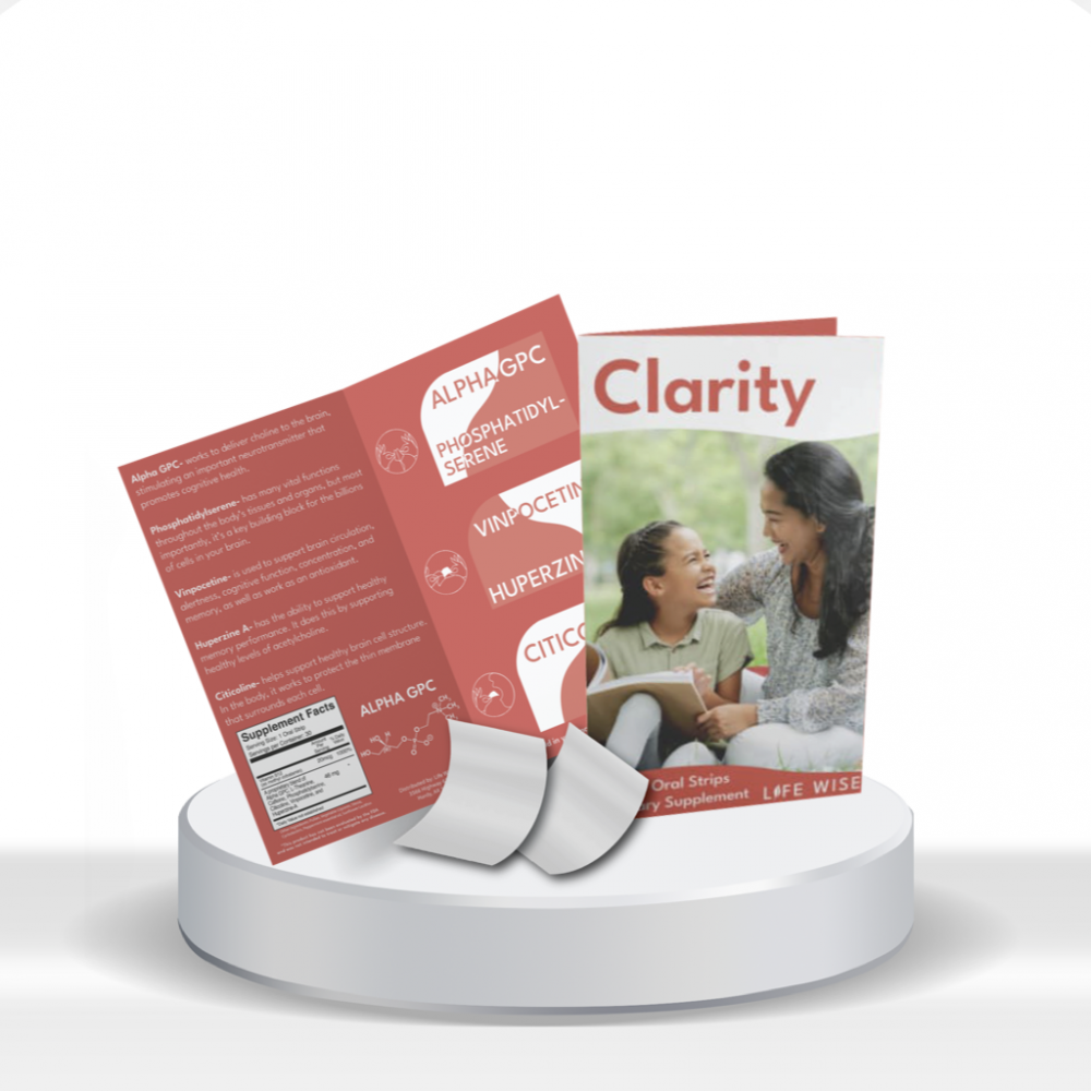 CLARITY is a dissolvable oral strip designed to support mental focus and cognitive performance. It contains a blend of natural ingredients, including Alpha GPC, L-Theanine, and caffeine, formulated to help promote mental clarity and sustained focus throughout the day. Alpha GPC supports brain function by boosting acetylcholine levels, while L-Theanine works to promote calm without drowsiness, and caffeine provides a natural energy boost to help keep you alert and focused.