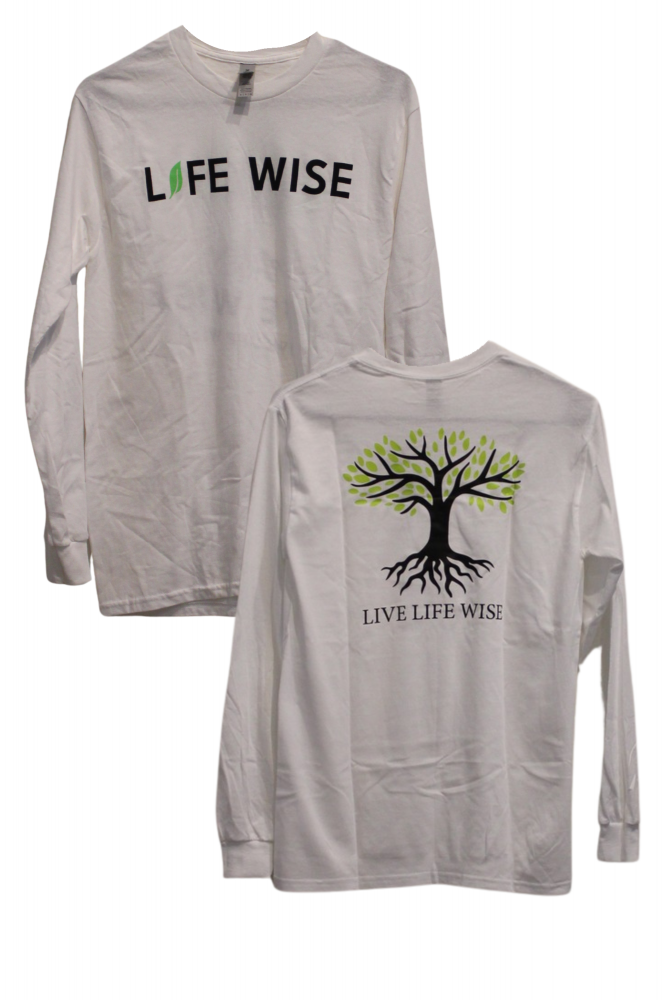 LIFE WISE LONG SLEEVE T-SHIRT w/ LIFE WISE LOGO ON FRONT AND TREE/LIVE LIFE WISE ON THE BACK 2XL-3XL