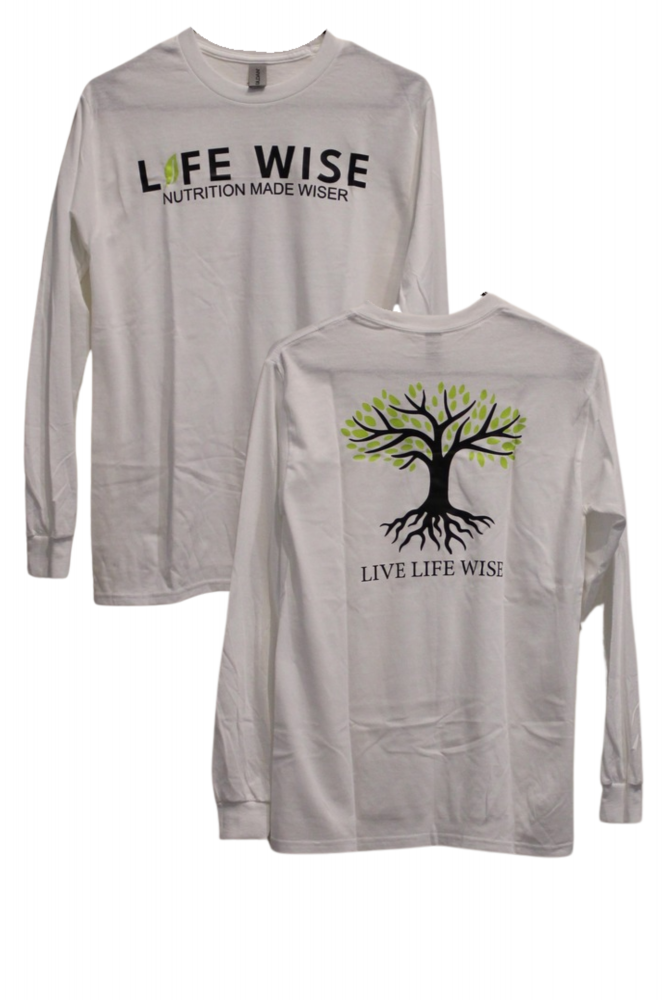 LIFE WISE NUTRITION MADE WISE LONG SLEEVE T-SHIRT w/ LIFE WISE LOGO ON FRONT AND TREE/LIVE LIFE WISE ON THE BACK Small-X-Large