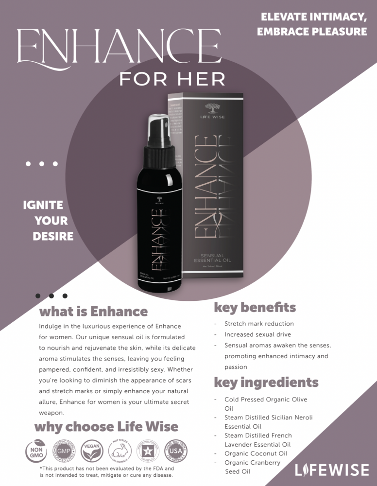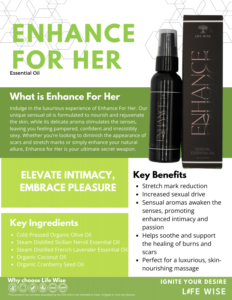 Whether used as part of your intimate moments or as a relaxing self-care ritual, ENHANCE for Her offers a gentle, natural way to care for your skin and elevate your sensory experience.