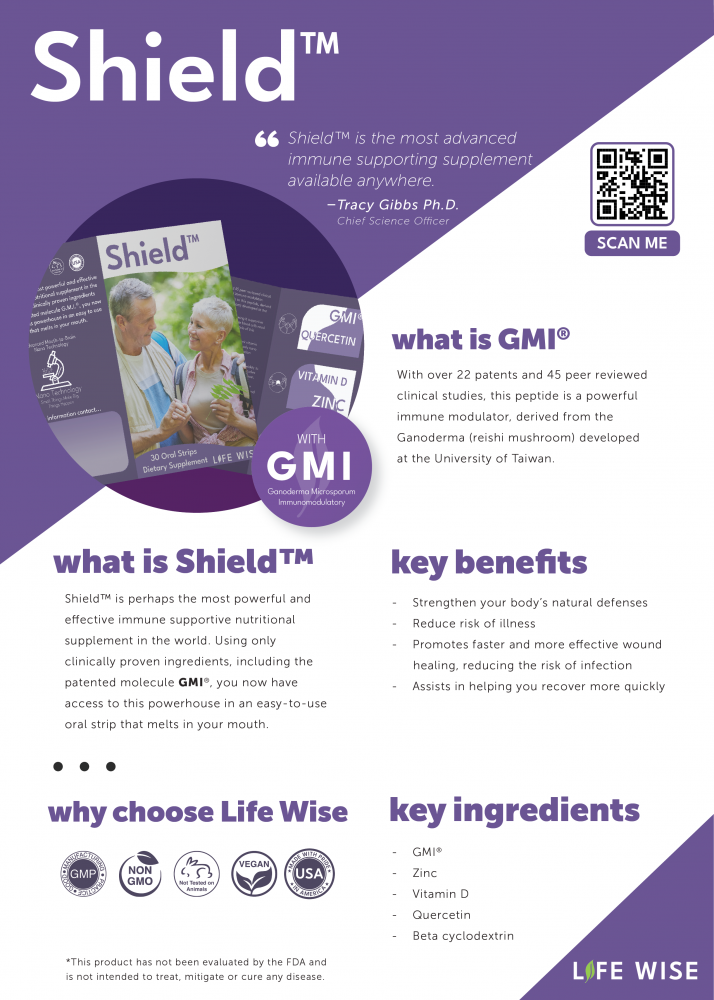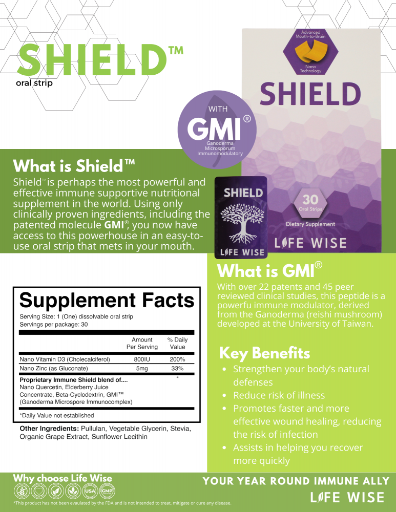 SHIELD is a dissolvable oral strip formulated to support your body’s natural immune defenses. It contains key ingredients like Nano Zinc, Vitamin D3, Nano Quercetin, and Elderberry Juice Concentrate. These ingredients work together to promote immune health and provide antioxidant support. Nano Zinc and Vitamin D3 play important roles in immune function, while Nano Quercetin and Elderberry offer additional support by helping to protect cells from oxidative stress.